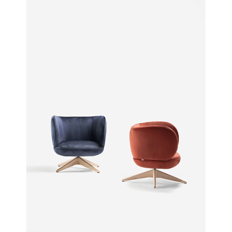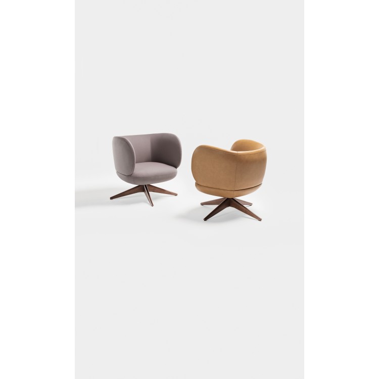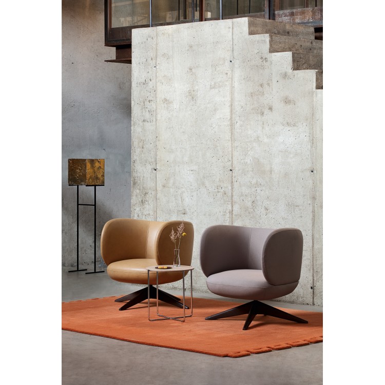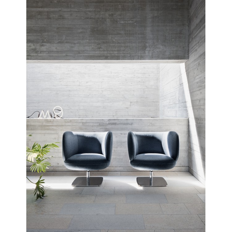 De loungestoel is verkrijgbaar met een draaibare metalen kolompoot of een 4-poots draaibaar onderstel.