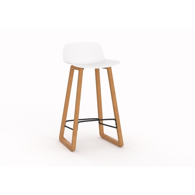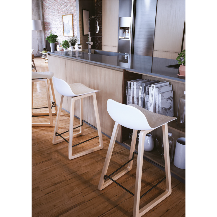 De zitting en rug zijn van kunststof zonder armleuningen. De zitting en de rugleuning zijn gemaakt van polypropyleen met een ruitvormig patroon reliëf. Cross beschikbaar in het zwart, wit, grijs en marineblauw. De zitting rust op een houten slede onderstel en is voorzien van een voetensteun voor extra zitcomfort.. De kruk heeft polypropyleen glijders onder het frame om de grond te beschermen tegen krassen.