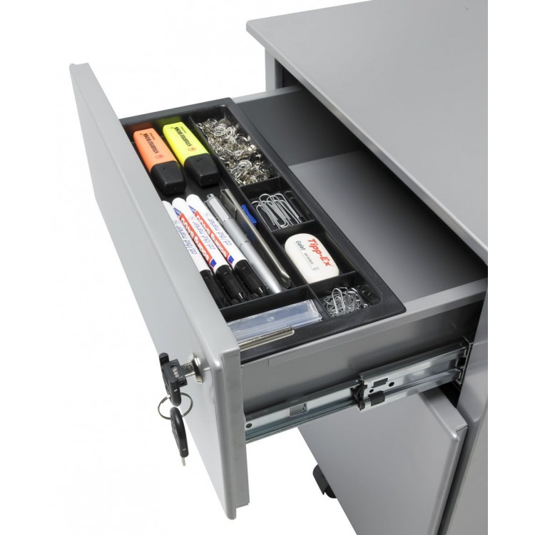 De Basic Plus ladekast heeft standaard een pennenlade in plaats van een losse pennenbak in de lade. Hij komt ook inclusief pennenlade en telescoopgeleiders. Ook is de bovenste lade op slot te doen.