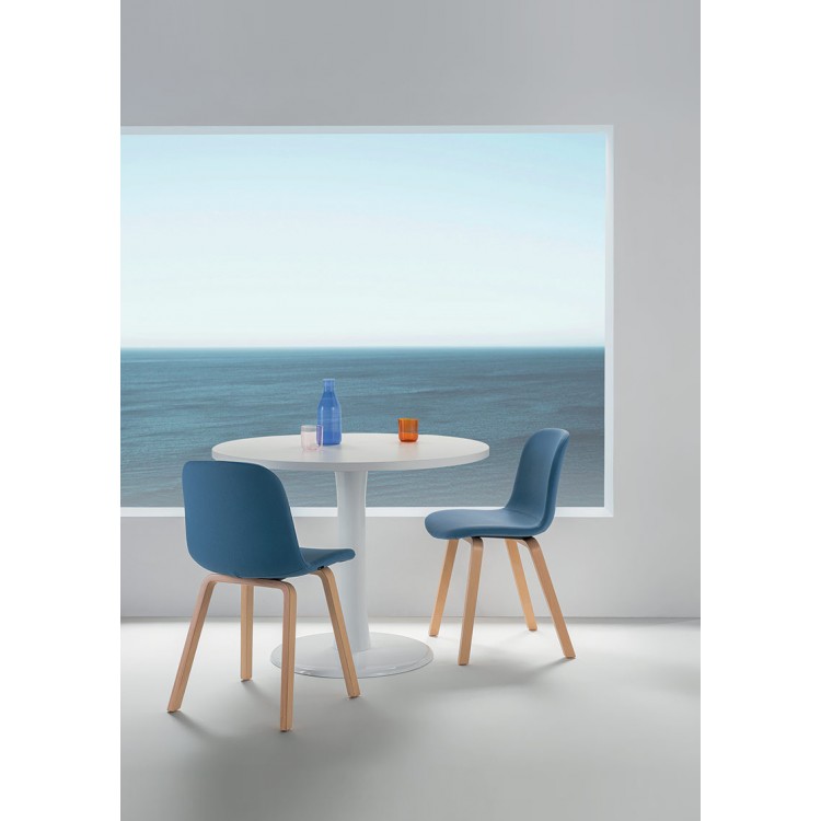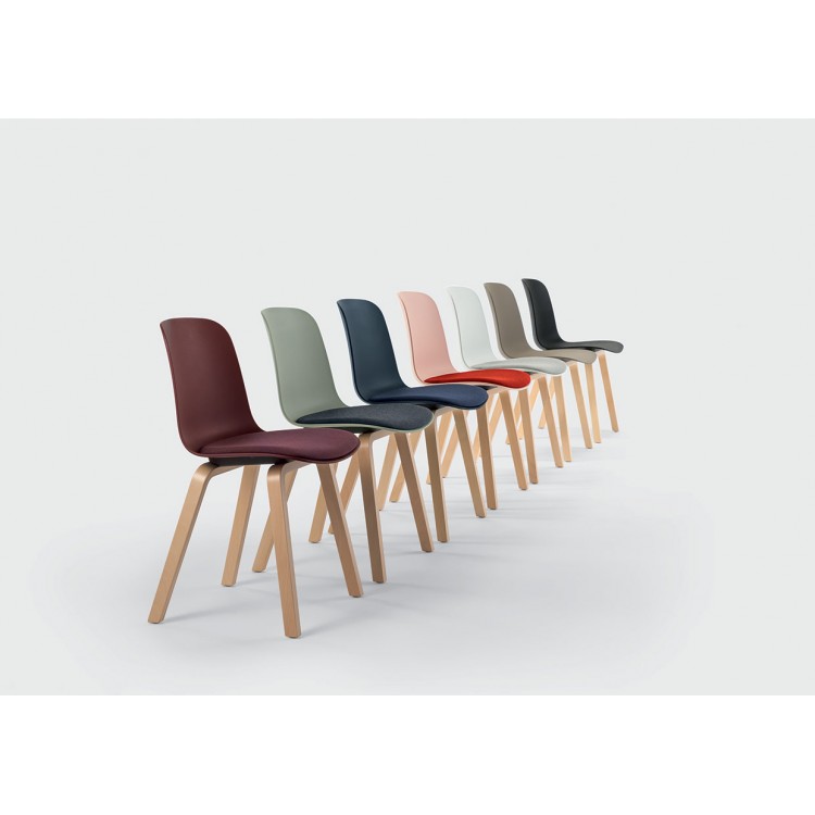 De poten zijn van hout in de kleur natural beech. Verkrijgbaar in 3 versies: standaard kunststof zitkuip, kuip met gestoffeerde zitting, kuip met volledige gestoffeerde zitkuip. Stapelbaar tot 3 stuks.