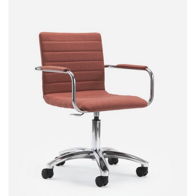 De vergaderstoel is 360 graden draaibaar, heeft een luxe design met prachtig afgewerkte stiknaden, een in hoogte verstelbare zachte zitting, armleuning voorzien van opdekje in dezelfde stof als de zitting, een verchroomde rugleuning, een gepolijst aluminium voetenkruis en een eenvoudig kantelmechanisme voor een fijne zithouding.