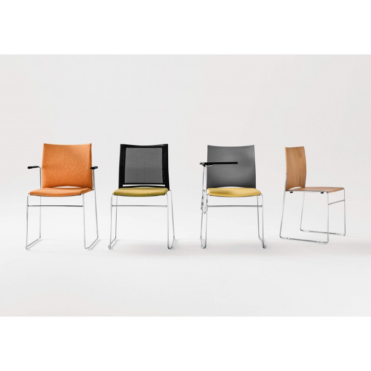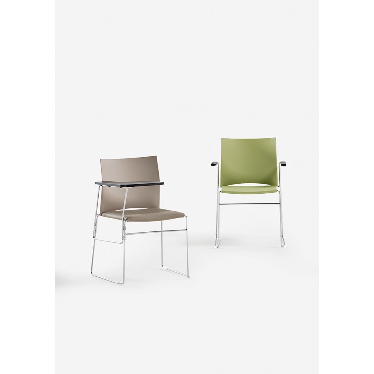 De stoel is verkrijgbaar met of zonder armleuningen en tegen meerprijs voorzien van een schrijftafel.