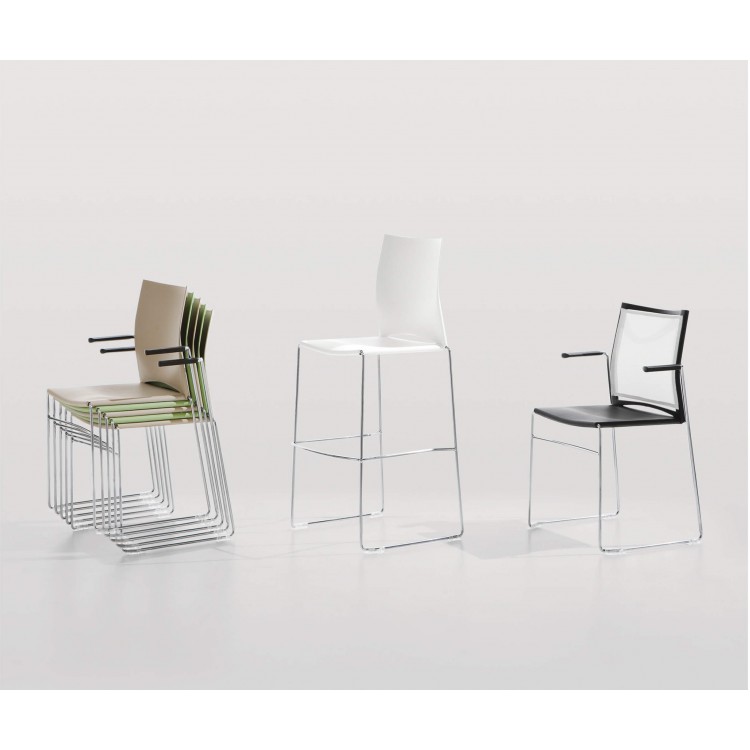 Het frame van Ultimo is van verchroomd metaal en de zitting is verkrijgbaar in kunststof of hout.