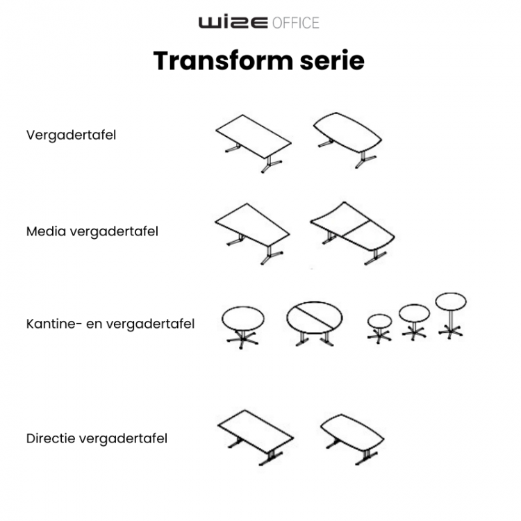 Transform is een veelzijdige en exclusieve serie geschikt voor kantoor, horeca of andere zakelijke omgevingen. De serie bestaat uit een zit-sta bureau, kantinetafels, vergadertafels, salontafels, mediatafels en exclusieve directie vergadertafels. Bureaus en tafels zijn onmisbaar en een belangrijk onderdeel van het bedrijf. Ontworpen voor vergaderingen, presentaties, werkplek, of trainingen.